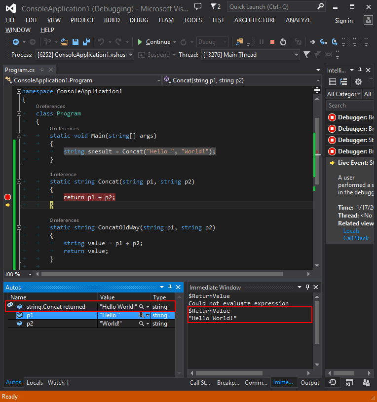 The good news is that starting from Visual Studio 2013 we do not have to do such trick anymore; we can directly examine the return value of a method even if there is no variable holding the value. We can do that at 2 moments in time: